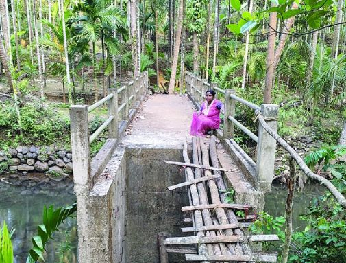 ದೇವಕಿಯವರು ಚಿಕಿತ್ಸೆಗಾಗಿ ಆಸ್ಪತ್ರೆಗೆ ಬರಬೇಕು ಎಂದರೆ ಇದೇ ಸೇತುವೆ ಗತಿ. ಅವರೊಂದಿಗೆ ಮತ್ತೆ ಮೂರು ಮನೆಯವರಿಗೂ ಈ ಸೇತುವೆಯೇ ಆಧಾರ. ದೇಹದ ಬಲಭಾಗದ ನ್ಯೂನ್ಯತೆಯಿಂದ ಬಳಲುತ್ತಿರುವ ದೇವಕಿ ಮರಾಠಿ ಅವರು ಸೇತುವೆಯ ಎರಡು ಕಡೆ ಮಣ್ಣು ತುಂಬುವAತೆ ಅರ್ಜಿ ಹಿಡಿದು ಅಲೆದಾಡುತ್ತಿದ್ದಾರೆ. ಆದರೆ, ಗುತ್ತಿಗೆ ಕೆಲಸ ನಿರ್ವಹಿಸಿದವರು ಊರಿನಿಂದ ನಾಪತ್ತೆ ಆಗಿದ್ದಾರೆ. ದೇವಕಿ ಅವರ ಅಳಲಿನ ಅರ್ಜಿ ಸರ್ಕಾರವನ್ನು ತಲುಪುತ್ತಿಲ್ಲ. ಅಲ್ಲಿನ ಕೆಲಸವೂ ಆಗುತ್ತಿಲ್ಲ.