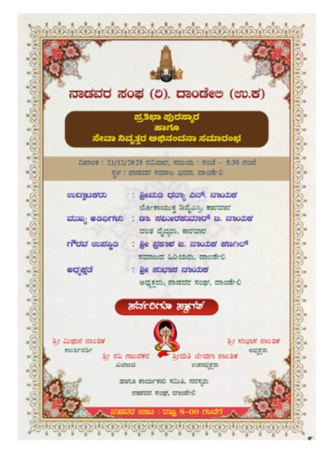 ದಾಂಡೇಲಿ ನಾಡವರ ಸಮಾಜದ ಆಶ್ರಯದಲ್ಲಿ ಇಂದು ಸಂಜೆ 5:30 ಗಂಟೆಗೆ ಪ್ರತಿಭಾ ಪುರಸ್ಕಾರ ಹಾಗೂ ನಿವೃತ್ತರ ಅಭಿನಂದನಾ ಕಾರ್ಯಕ್ರಮ ನಾಡವರ ಸಮಾಜದ ಸಭಾ ಭವನದಲ್ಲಿ ನಡೆಯಲಿದೆ.