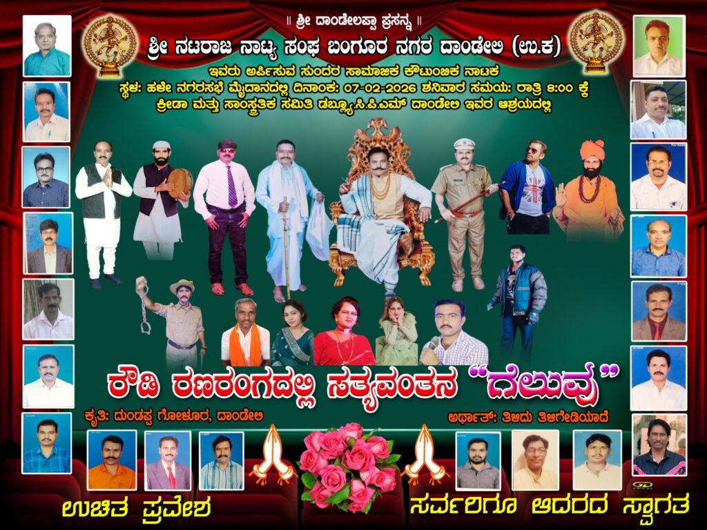 ಕ್ರೀಡಾ ಮತ್ತು ಸಾಂಸ್ಕೃತಿಕ ಸಮಿತಿ ವೆಸ್ಟ್ ಕೋಸ್ಟ್ ಕಾಗದ ಕಾರ್ಖಾನೆ ಇವರ ಆಶ್ರಯದಡಿ ಕನ್ನಡ ಸಾಹಿತ್ಯ ಪರಿಷತ್ ಜಿಲ್ಲಾ ಮತ್ತು ತಾಲೂಕು ಘಟಕದ ಸಹಕಾರದಲ್ಲಿ ದಾಂಡೇಲಿ ನಗರದ ಹಳೆ ನಗರಸಭೆ ಮೈದಾನದಲ್ಲಿ ಫೆಬ್ರವರಿ 7ರಂದು ಶನಿವಾರ ರಾತ್ರಿ 7:30 ಗಂಟೆಯಿಂದ ಹಿರಿಯ ನಾಟಕಕಾರ ದುಂಡಪ್ಪ ಗೂಳೂರು ವಿರಚಿತ ಶ್ರೀ ನಟರಾಜ ನಾಟ್ಯ ಸಂಘ ಅರ್ಪಿಸುವ “ರೌಡಿ ರಣರಂಗದಲ್ಲಿ ಸತ್ಯವಂತನ ಗೆಲುವು” ಎಂಬ ಸುಂದರ ಸಾಮಾಜಿಕ ನಾಟಕ ಪ್ರದರ್ಶನ ನಡೆಯಲಿದೆ ಎಂದು ನಾಟಕದ ನಿರ್ದೇಶಕ ಹಾಗೂ ಹಿರಿಯ ಸಾಹಿತಿ ಮುರ್ತುಜಾಹುಸೇನ್ ಆನೆಹೊಸೂರ ಅವರು ಹೇಳಿದರು.